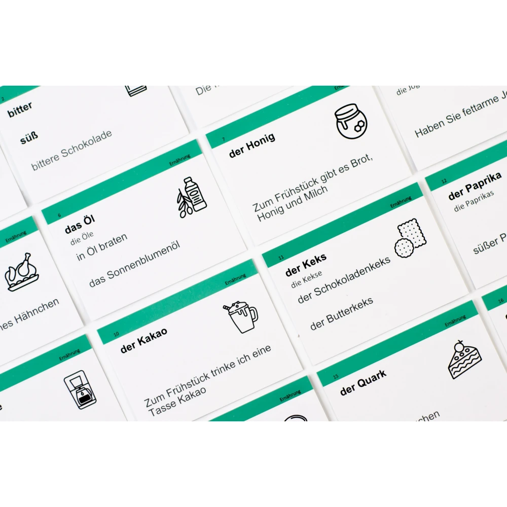 С обучающим набором карточек, Вы сможете быстро и без особых усилий выучить больше чем 1000 новых слов по 30 темам и вместе с этим улучшить уровень своего немецкого и стать интересным собеседником.