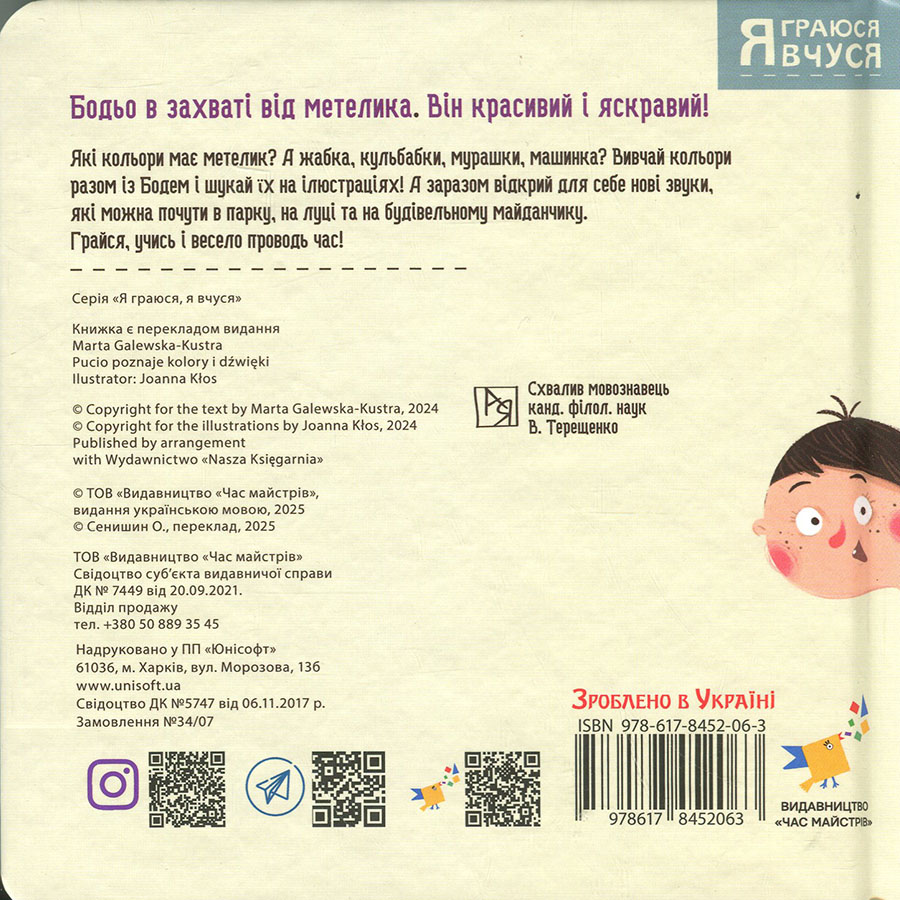 Бодьо із захопленням спостерігає за метеликом — таким яскравим і барвистим! Які кольори він має? А якого кольору жабка, кульбабки, мурашки чи машинка? Долучайся до Бодя, вивчай кольори разом із ним і шукай їх на сторінках книжки! А ще відкрий для себе нові звуки, що лунають у парку, на лузі та навіть на будівельному майданчику. Навчайся, грайся й відкривай світ із задоволенням!