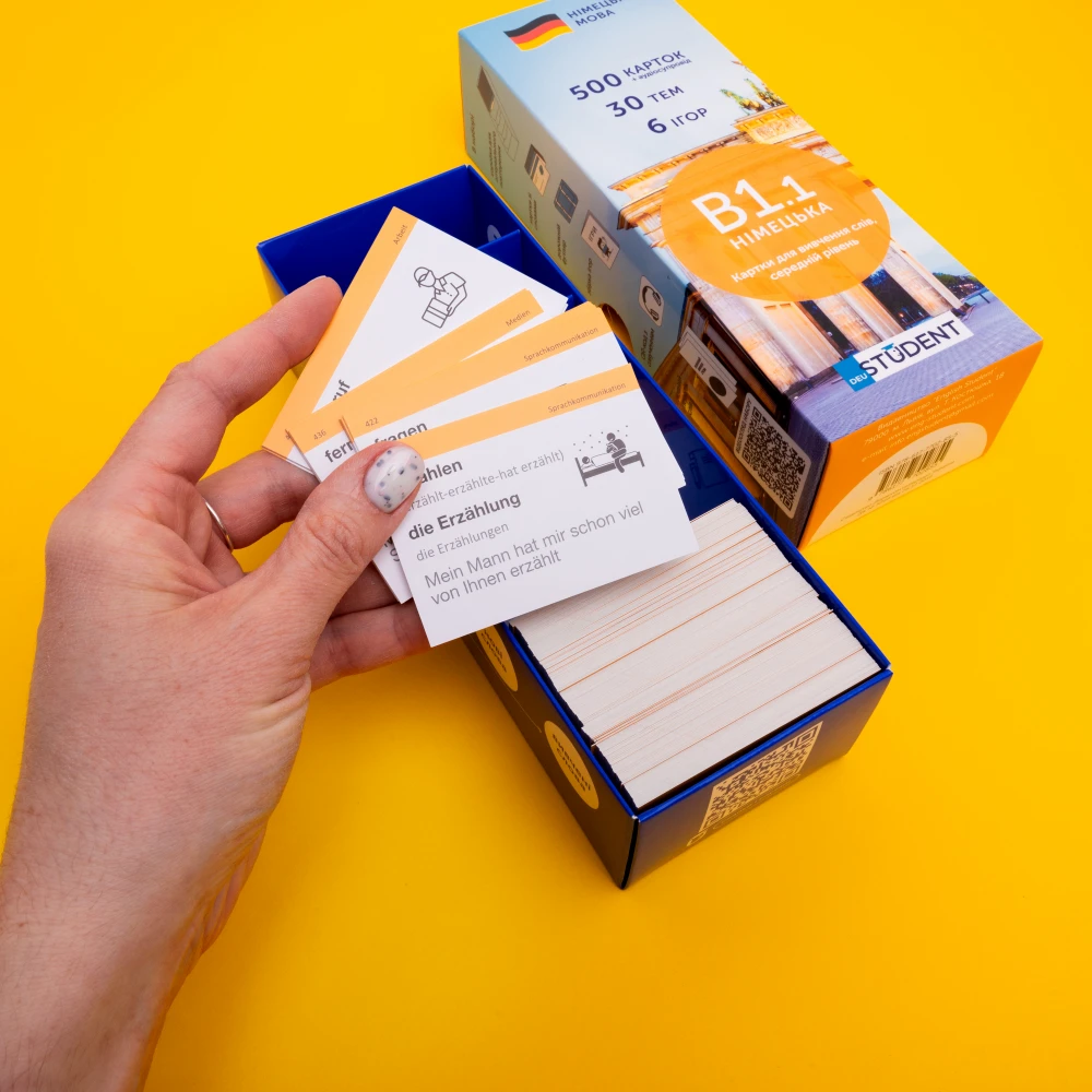 Німецька В1.1 – перша частина середнього рівня — для тих, хто вже опанував базові рівні та хоче почати розуміти інших, дивитись фільми й читати нескладні тексти німецькою. Картки цього рівня допоможуть опанувати базову розмовну лексику.