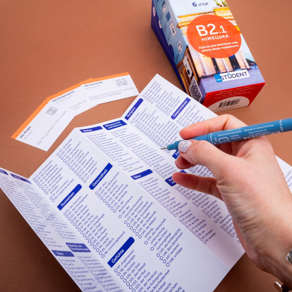 За допомогою мінікарток для вивчення німецької мови (рівень B2.1) від English Student легко і цікаво вивчати іноземну мову. Рівень В2.1 – це рівень володіння німецькою мовою вище середнього!