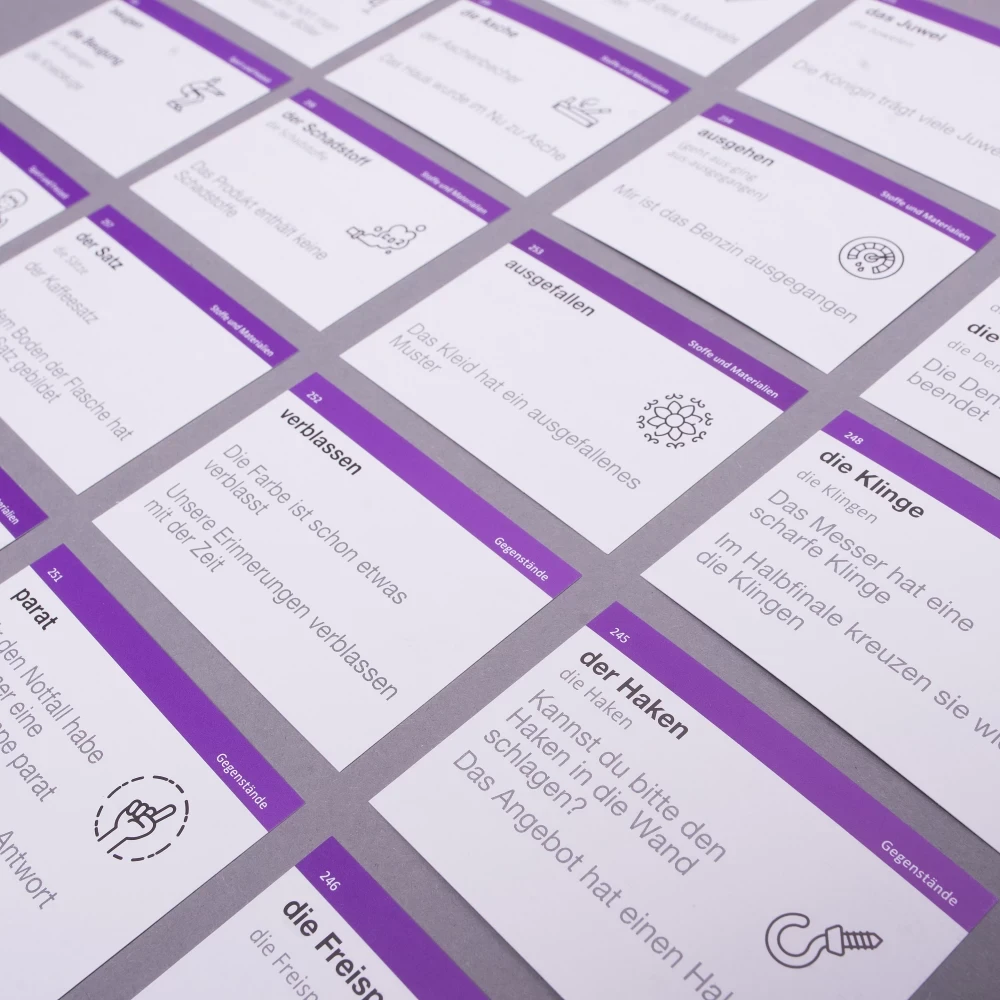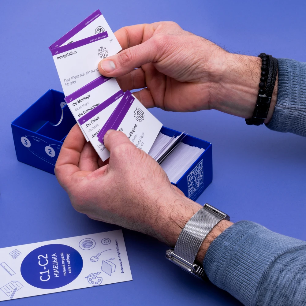 Картки для вивчення німецької на рівні С1-С2 – це просунутий набір для тих, кого не лякають довгі слова типу (der) Sommerschlussverkauf. Підійде тим, хто хоче володіти німецькою на рівні справжнього німця і стати muttersprachler.